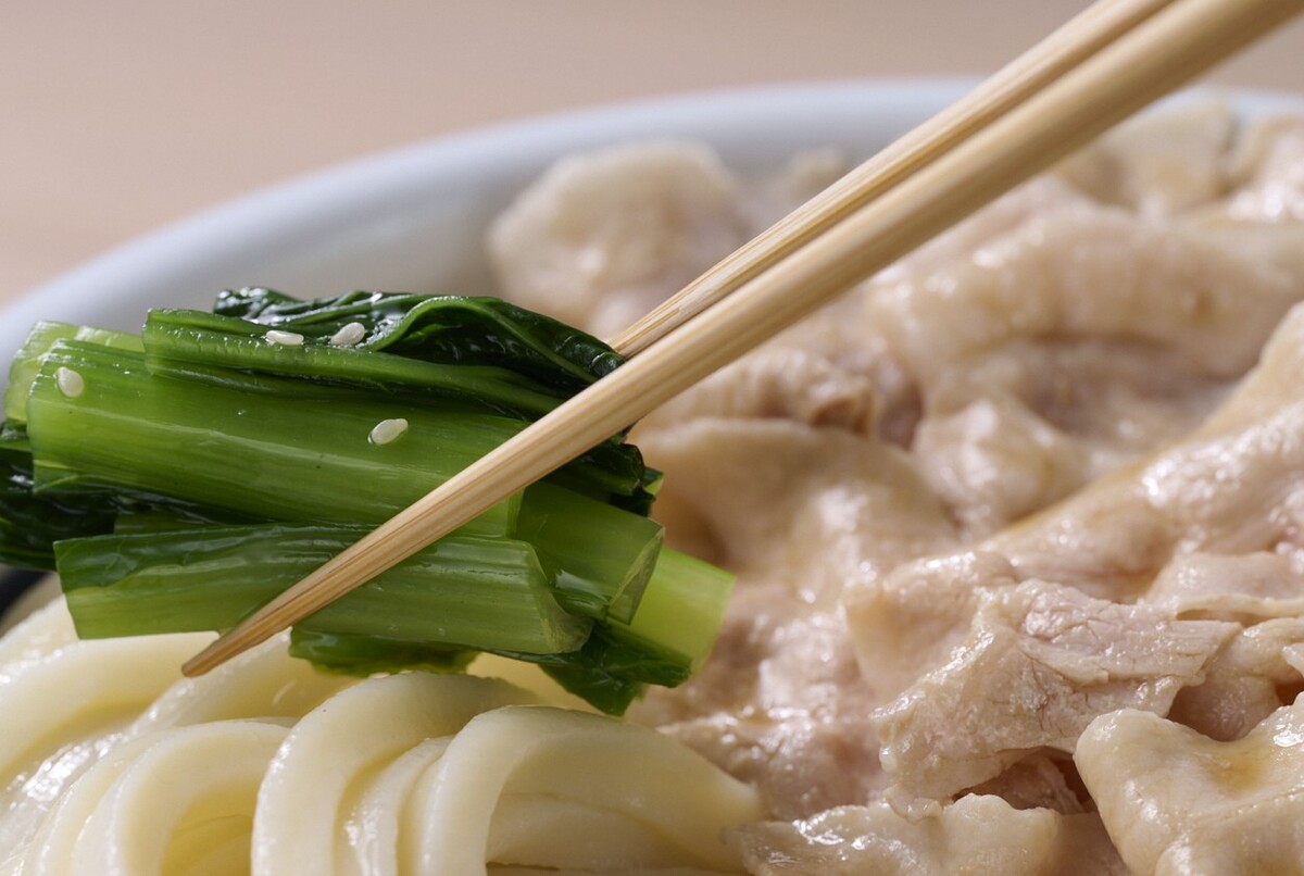 温泉玉子つきで、甘辛いつけ汁にラー油を効かせた一品。具材は、豚しゃぶとごま油が香るシャキシャキの小松菜ナムルがのっています。豚しゃぶは、店内で湯通ししたあと、特性だしに漬け込んでいます。