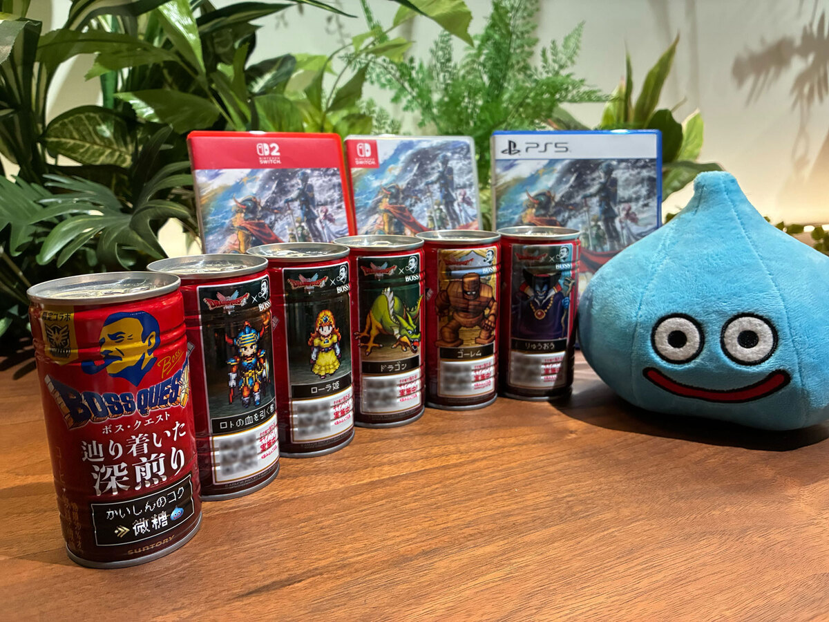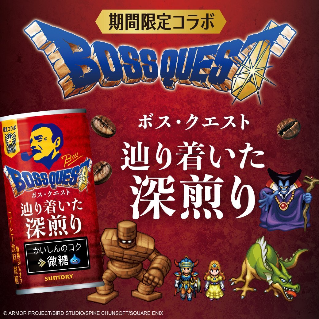 これは10月30日に発売するHD-2D版「ドラゴンクエストI&II」とのコラボで、缶コーヒーBOSSのパッケージにドラゴンクエストのロゴやキャラクター、モンスターなどが描かれている。