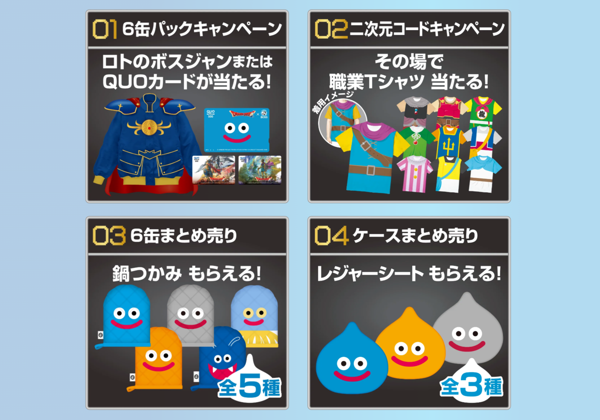 限定パックを購入すると抽選で「ロトのボスジャン」や「オリジナルQUOカード」が当たるキャンペーンや、「ドラゴンクエスト」の職業をモチーフにしたTシャツ、鍋つかみにレジャーシートなどがもらえるキャンペーンを実施中。無くなり次第終了となるので、欲しい勇者は急いだほうがいいだろう。