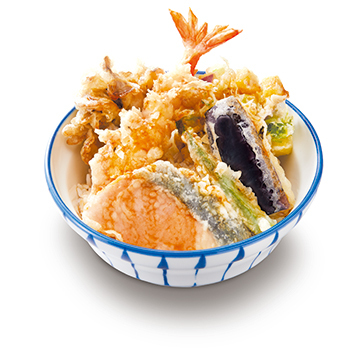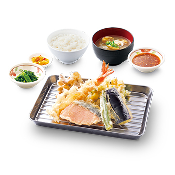 北海道産秋鮭に、さつまいもと三つ葉のかき揚げや舞茸、海老、なす、オクラを合わせた一品です。特製の天丼タレで味わう、秋の彩り豊かな天丼です。