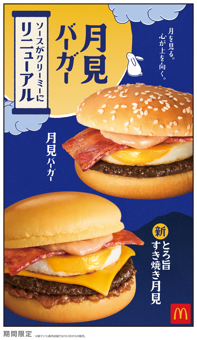 さらに、夜の時間限定でビーフパティを3枚にした「トリプルビーフのとろ旨すき焼き月見」が登場します。