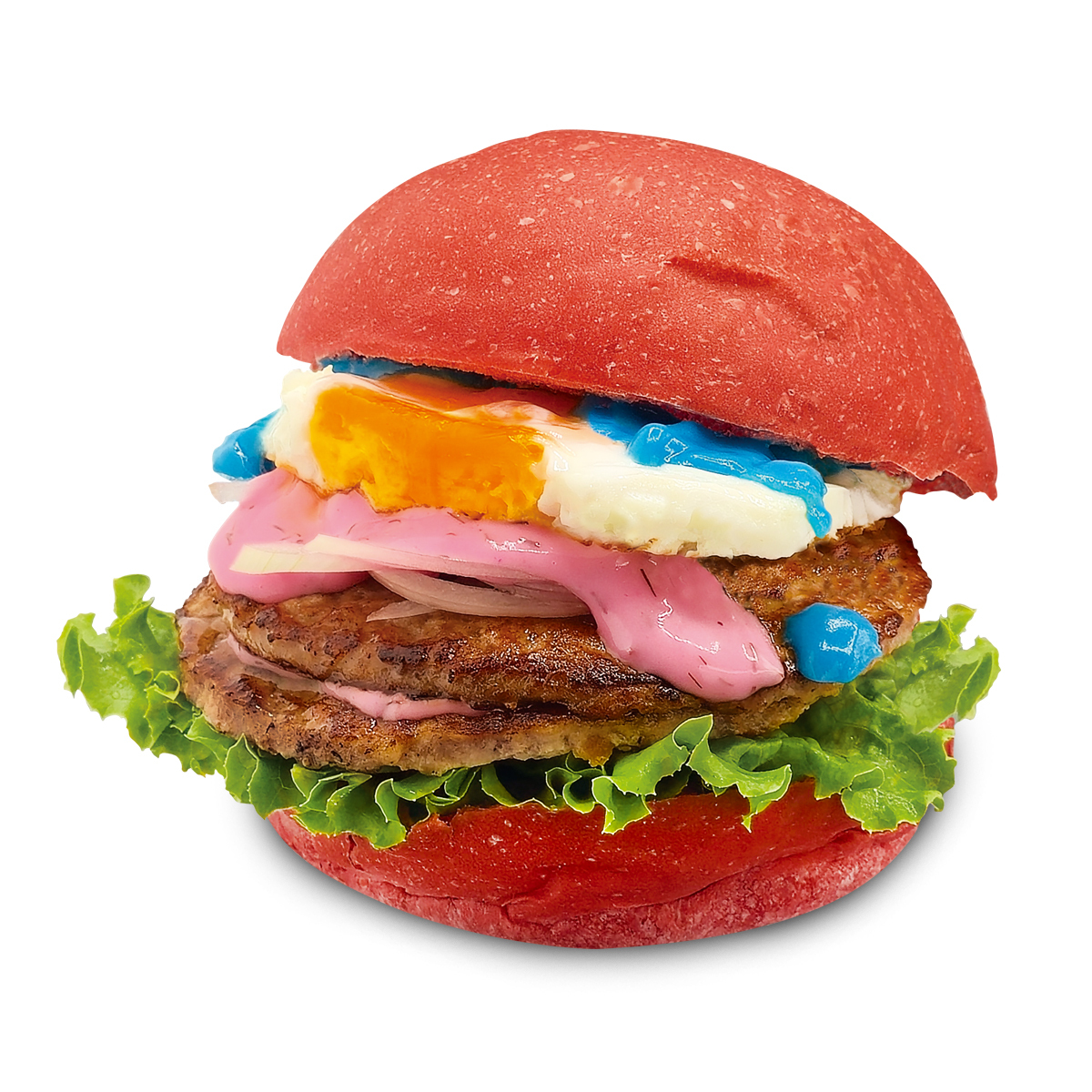 カラフルで迫力満点の仕上がりはカオスの域で、目の前に出てきた瞬間に圧倒されそうです。ここまでインパクトのあるバーガーはなかなかないので、正直食べるのに少し勇気がいりそうですが……。そのユニークさも含めて楽しみたくなる一品です!