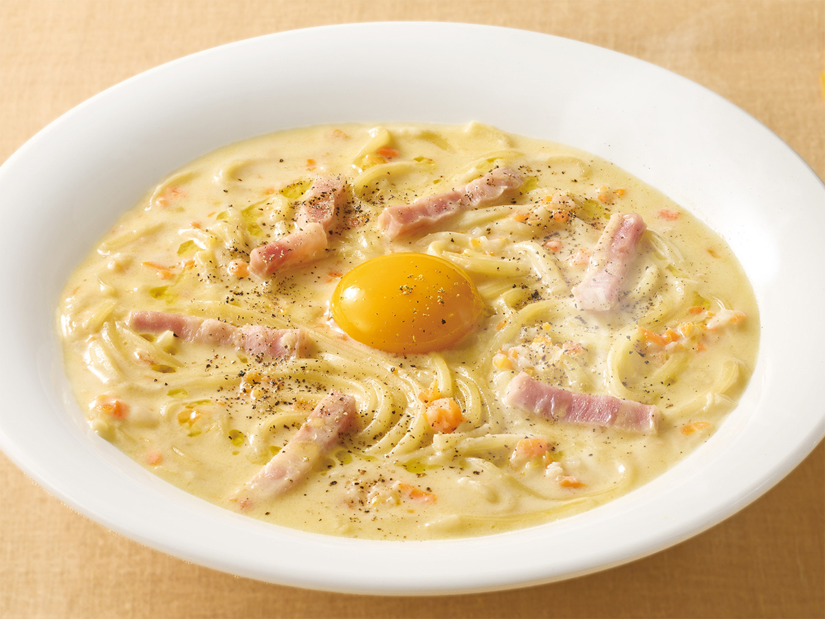 野菜とミルクのチャウダーのような優しい味わいに、チーズと卵黄を合わせてカルボナーラ風のコクを加えたハイブリッドパスタです。
