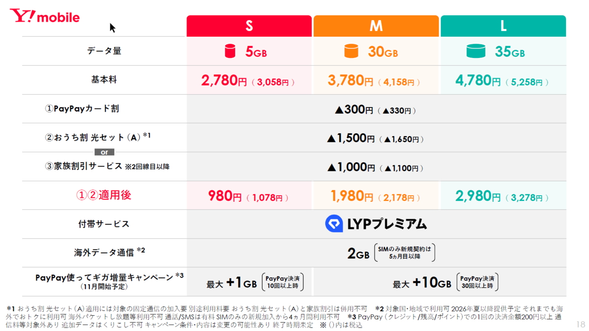 シンプル3 S/M/Lは、いくつかのサービス追加はあるものの基本的には値上げ。ただし、PayPayカード利用者や対応固定回線の利用者については割引額の増額により、割引の適用後は従来と同じ金額になることがアピールされている。
