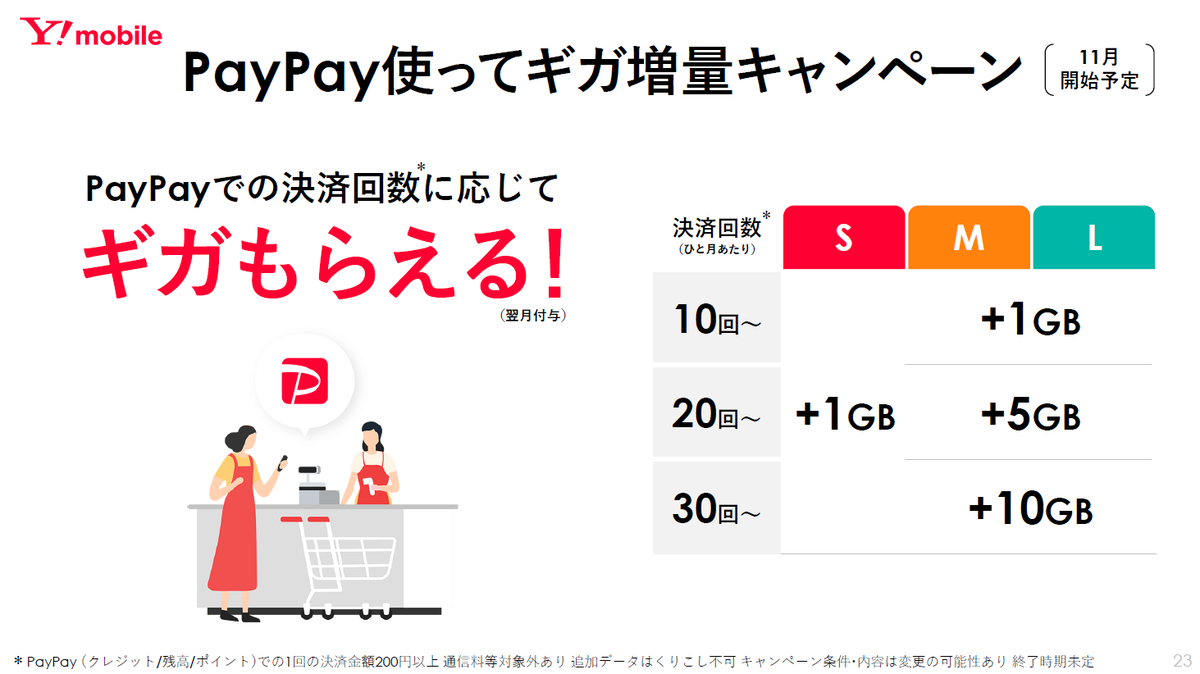 また、11月開始予定のキャンペーンとして、「シンプル3 S」利用者はPayPayを月10回以上決済すると1GB、「シンプル3 M/L」は30回以上で10GBがプレゼントされる。