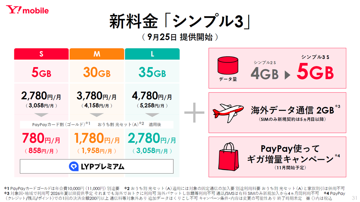 Y!mobile(ソフトバンク)は、新料金プラン「シンプル3 S/M/L」を9月25日に開始する。これにともない、現行プランの「シンプル2 S/M/L」の開始に合わせて新規受付を終了する。