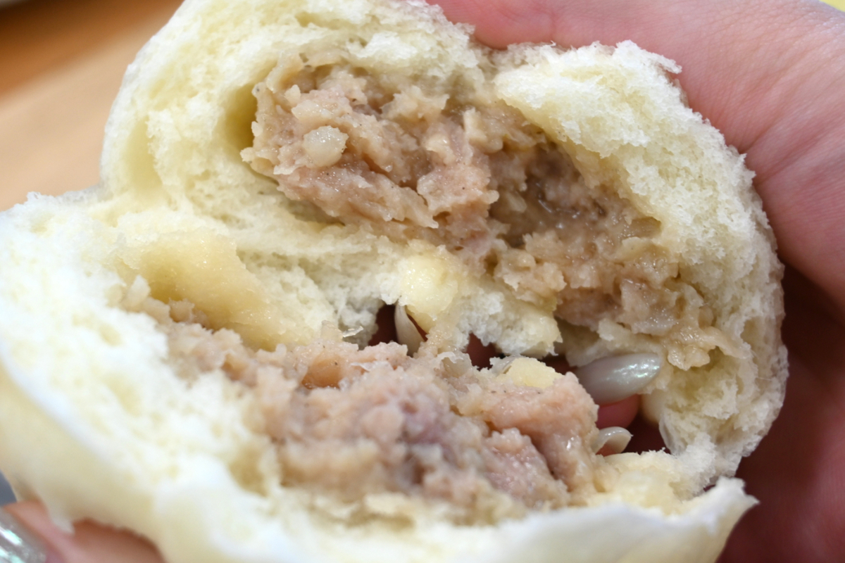 あーんと頬張ると、もちっとした厚みのある生地と、中の肉あんのゴロゴロとした食感がたまりません! 肉あんには淡路産をはじめとする国産玉ねぎを100%使用しており、その甘みがしっかりと広がります。味付けはシンプルな塩味だからこそ、ジューシーな豚肉の旨みと素材本来のおいしさが存分に感じられます。