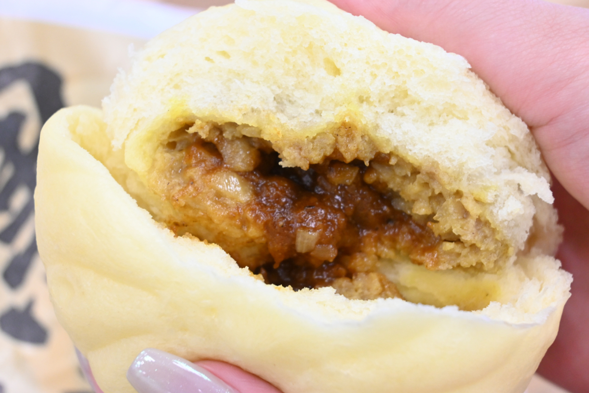 わくわくしながらガブッといくと、カレーの味わいとともにゴロゴロした豚肉が感じられて、肉感がすごい。「カレーまん」だと思って食べると、一般的なカレーまんはトロッとしたカレーソースがメインなので、こんなにお肉が入っているとまったく別物です。主役はやっぱりお肉なんですよ。