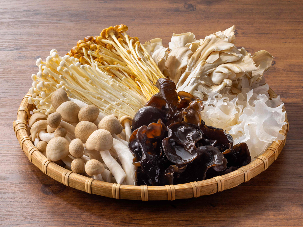今回のフェアでは、通常ラインアップのしめじ・えのき・きくらげに加え、茶えのき・クリーム色舞茸・白きくらげが登場し、きのこは6種類に拡大しました。