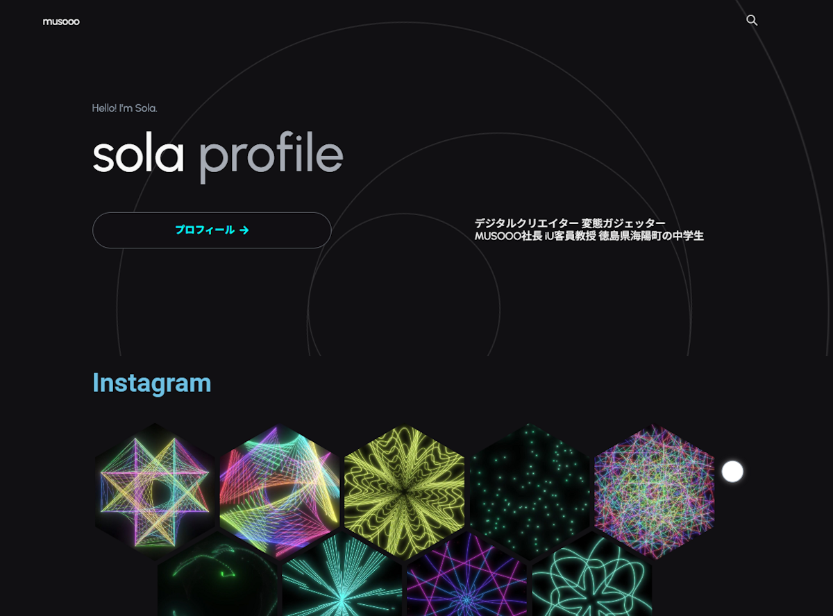 その公式ページ(https://musooo.com/)を見ると、「デジタルクリエイター 変態ガジェッター MUSOOO社長 iU客員教授 徳島県海陽町の中学生」と書かれている。