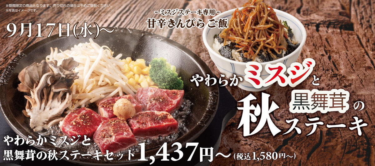 ペッパーランチは「やわらかミスジと黒舞茸の秋ステーキセット」(1580円〜)を、9月17日より期間限定で販売する。