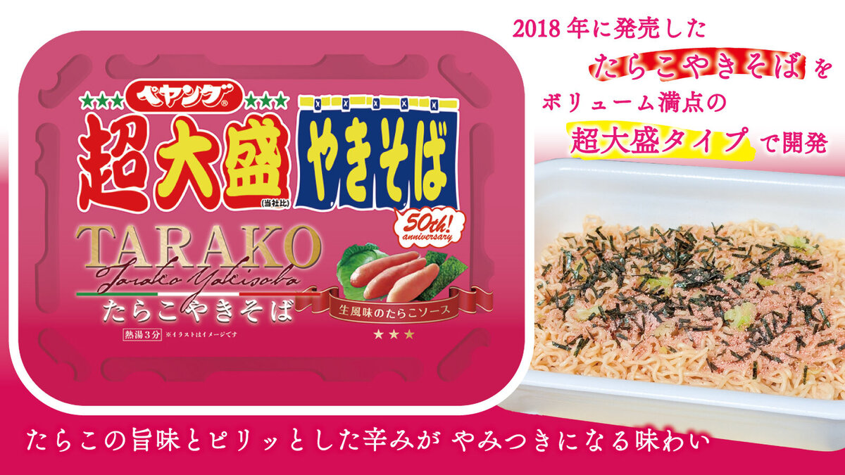 2018年に発売され好評だったという「たらこやきそば」を超大盛タイプで開発した商品で、たらこの旨味が効いたソースと、つぶつぶとした食感のたらこかやくを使用することで、たらこ好きにはたまらない味わいに仕上げたといいます。