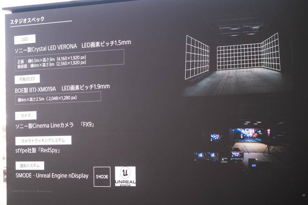 ソニー製のCrystal LED VERONA(1.5mmピッチ)を使用したL字型のLEDウォール(正面は6.5×3mで4160×1920画素、垂直面は4×3mで2560×1920画素)をメインに、反射用の可搬型LED(BOE製のBTJ-XM019A、1.9mmピッチ、4×2.5mで2048×1280画素)などを組み合わせたコンパクトな構成。Cinema Lineカメラの「FX9」やstYpeのトラッキングシステム「RedSpy」、SMODE・Unreal Engine nDisplayを使った送出システムが設置されている。