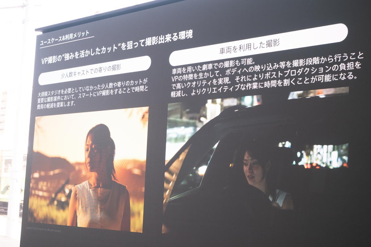 ソニーPCLはその一方で既存の大型スタジオを使うような大規模なプロジェクトではなく、より小規模・高効率で始められる「スマートVPステージ」のプロジェクトも推進している。例えば、グラフィック撮影やCMのワンシーンだけにバーチャルプロダクションを使いたいといったニーズに対応する。出演者が少なくアップを中心としたカットの撮影や、車の運転シーンなどでボディーやガラスに光が映り込む表現を撮影段階から高いクオリティにしておきたいといった用途を想定しているそうだ。