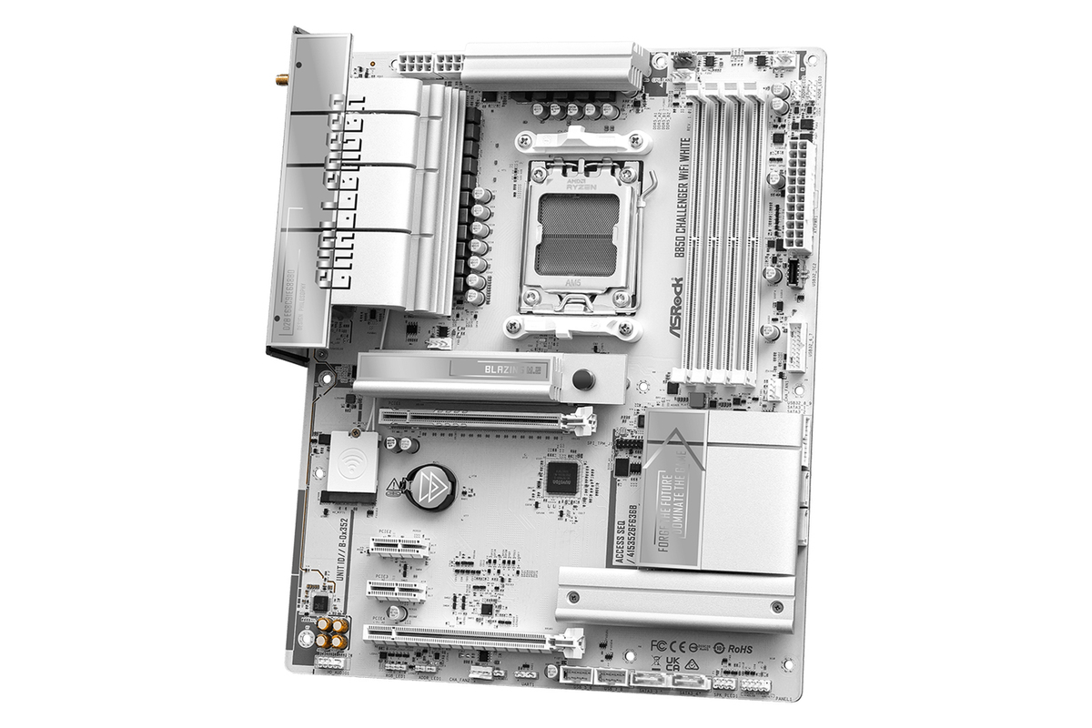 マザーボードはASRock「B850 Challenger WiFi White ドスパラ限定モデル」だ。白色の定番マザーボードと言えば、ASRock「Steel Legend」シリーズになるが、「B850 Challenger WiFi White ドスパラ限定モデル」は、メモリースロットなどのコネクターも真っ白なのが見どころ。