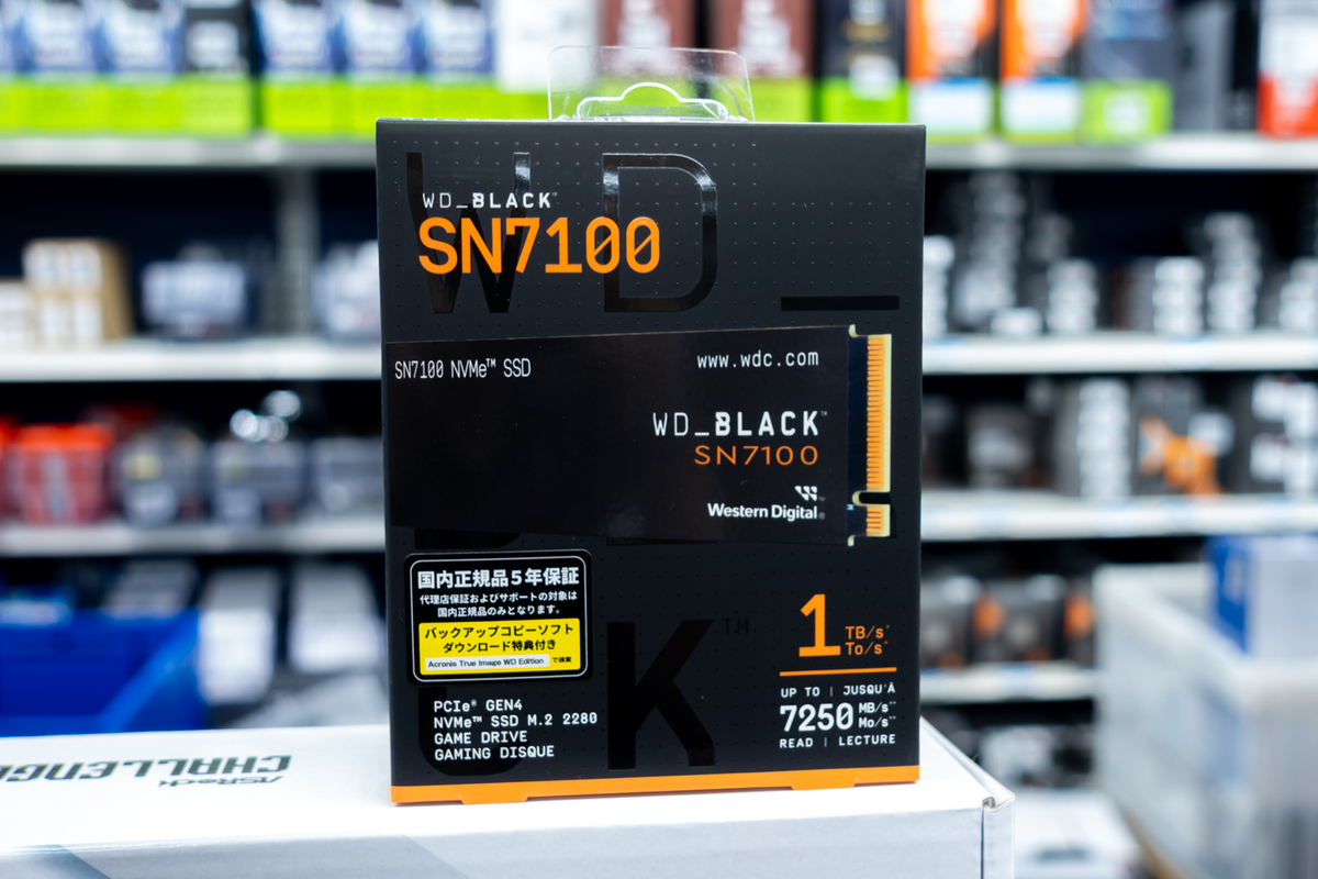 メインストレージのSSDは、Sandisk(Western Digital)「WD_Black SN7100」だ。コストを抑えながら、読み出し速度7250MB/秒、書き込み速度6900MB/秒というPCIe4.0×4 SSDトップクラスの性能を発揮する。