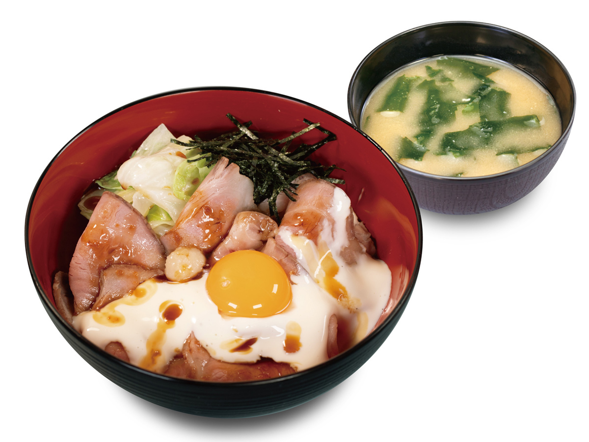 しっとりやわらかな食感のローストポークをたっぷり盛り付けた丼ぶりです。しょうゆベースのローストポークソースと、この商品のために開発されたレフォールソースの2種類の特製ソースが肉の旨みを引き立てるといいます。