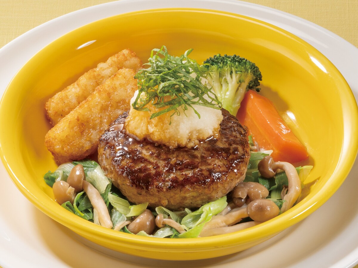 ふっくらジューシーハンバーグに、大葉・ねぎ・大根おろしの爽やかさが絶妙にマッチ。ポン酢と香味野菜が香り高い、さっぱりと仕立てたという和風ハンバーグです。