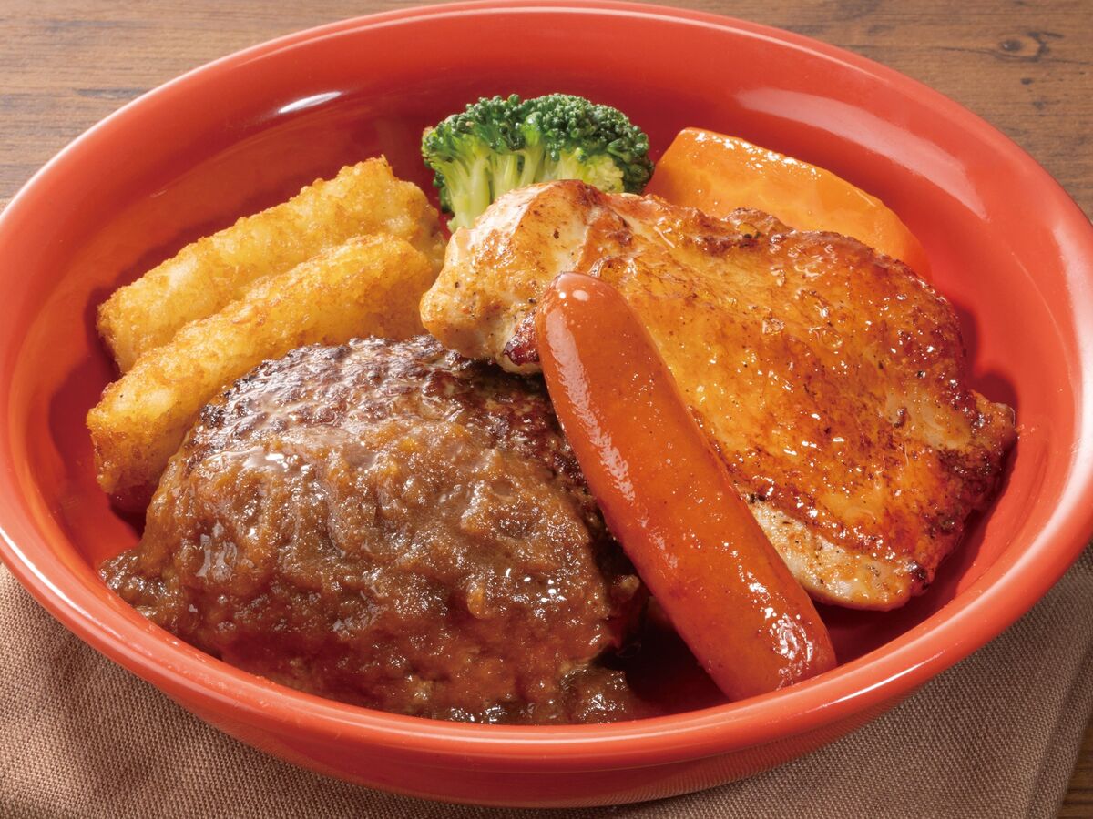 2種類の粗挽きビーフをつなぎの卵やパン粉は使わず、5種のスパイスで仕上げた肉感のあるジューシーハンバーグと、4種のスパイスと醤油でマリネしたチキンを楽しめる一皿。