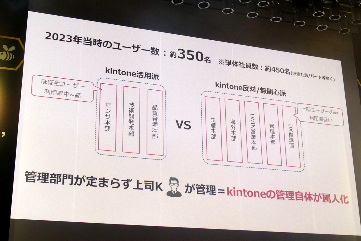結果、2023年にはkintoneのユーザー数も約350名に膨らんだ。単体の社員数で約450名なので、かなりの割合だ。しかし、「勝手にアプリ作れるkintoneってどうなの?」とDX部門が懸念を持っていたことで、管理部門が定まらなかった。こうして社内が活用派と反対派・無関心派に分かれた結果、今の上司が管理するという状態が長く続き、kintoneの管理自体が属人化してしまうことになった。こんな中、異動してきたのが齊藤氏だ。