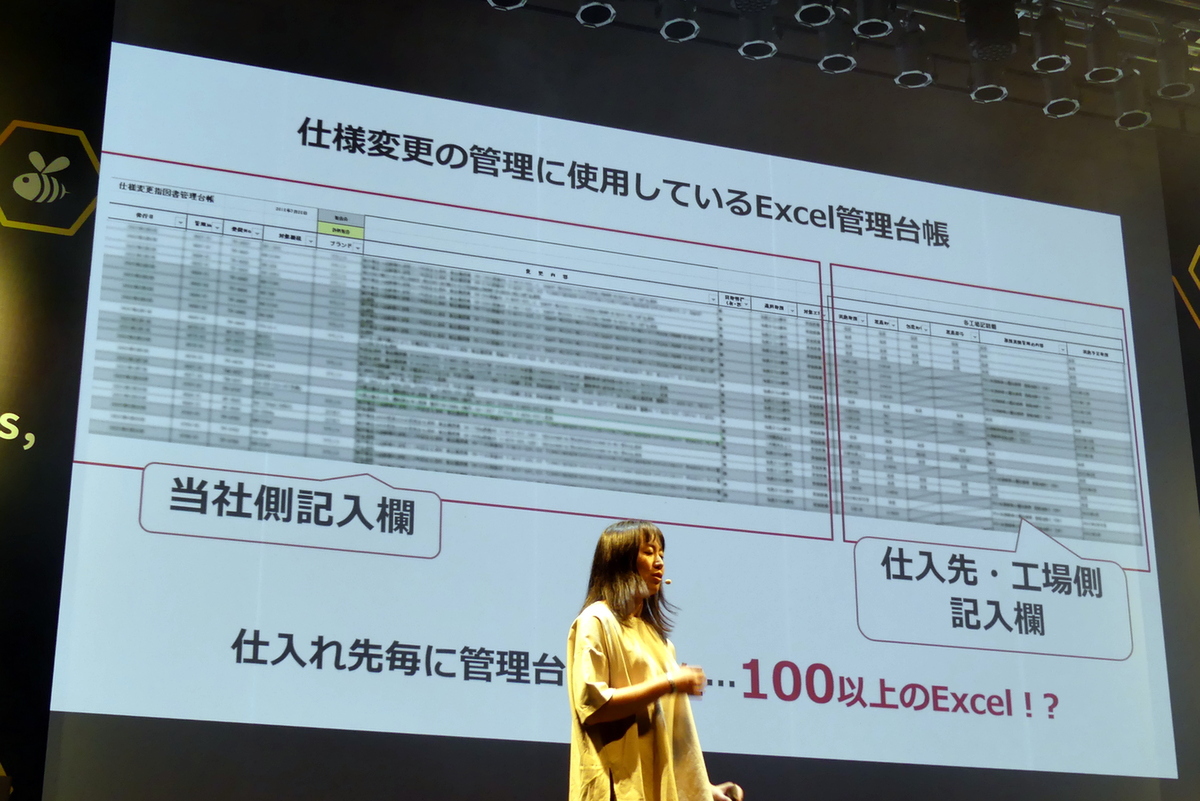 1つ目は、「管理が煩雑な管理台帳」だ。当時、生産本部では仕様変更の管理にExcelを使っていたが、これがとにかく横長。しかも、100社以上の仕入れ先ごとにExcelファイルが存在していたという。仕様変更も年間600件とかなり多く、そのたびにメールでExcelの行を指定する必要がある。当然、最新版を管理するのは大変で、ccされる上司への大量のメールは当然未読となってしまう。