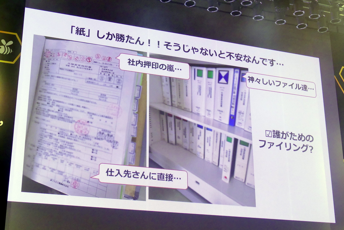 3つ目は、「『紙様』信仰」だ。「結局、メールを送っても、仕入れ先がきちんと見てくれたか、不安になるんです。だから、紙で仕入れ先の押印をもらっています。社内の人もちゃんと見たか不安なので、全員押印をもらっています」とのこと。もはや社内の人間ですら信用できない状況。しかも、押印された書類を閉じるフォルダは、なにか問題がない限りは閲覧されない。
