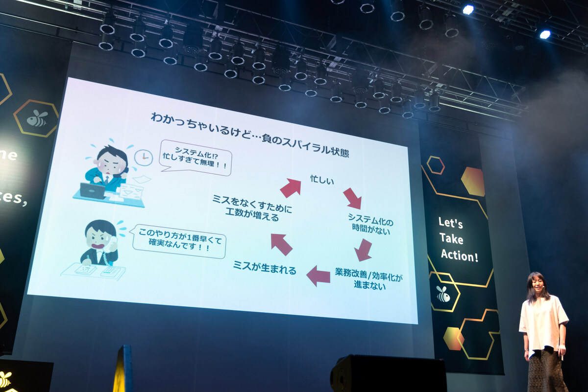 紙なので、書類作成、配布受領、実施状況の報告、仕入れ先の管理、部内管理まで当然ながら事務処理も煩雑。しかし、忙しすぎるため、システム化の時間が取れない。「このやり方が一番いいんです!」と現場はやり方を変えないため、ミスが起こる。ミスが起こると、ミスをなくすための工数が増え、さらに忙しくなる。まさに「負のスパイラル」だ。