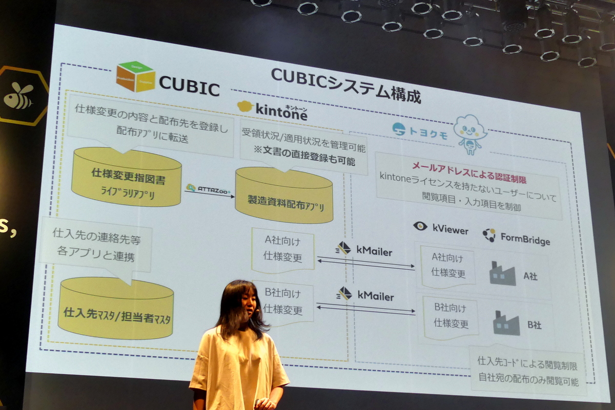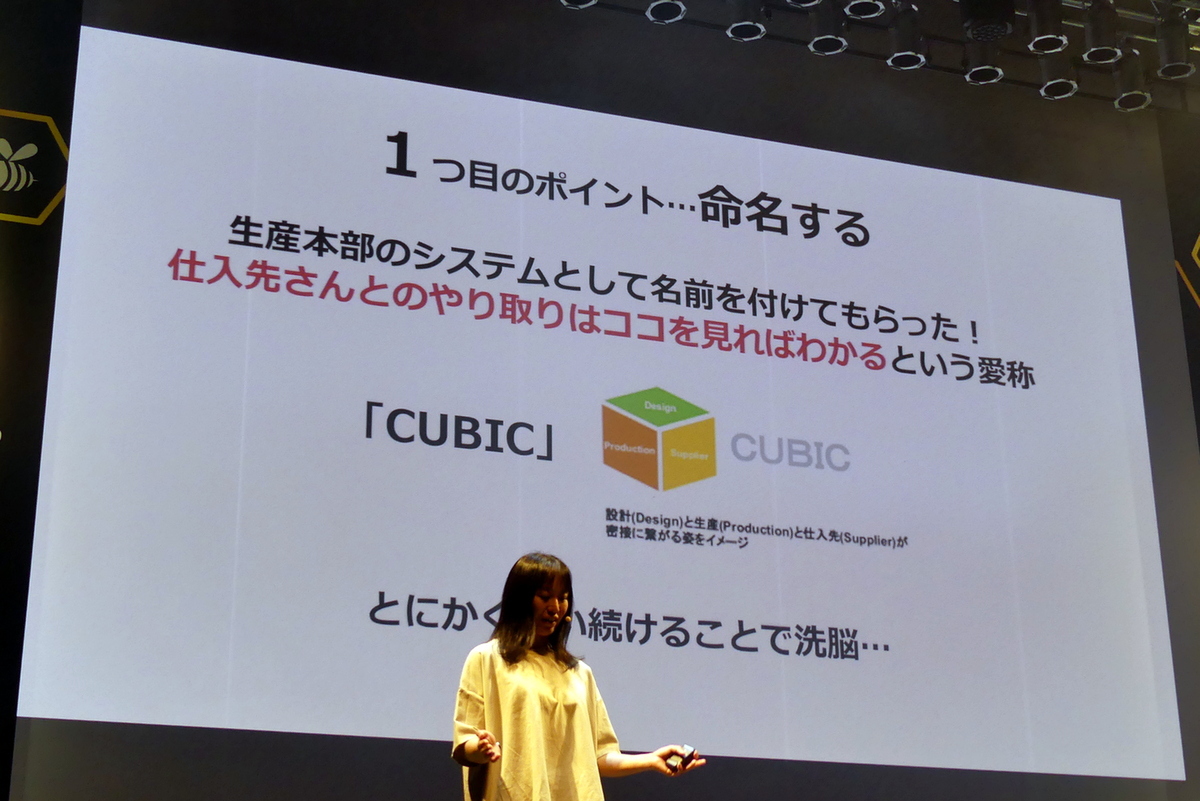 1つ目はアプリの名前だ。通常アプリの名前は、「日報アプリ」や「顧客管理アプリ」など機能がわかりやすいものになるが、今回構築した仕入れ先・外注管理のアプリは生産本部に依頼し、シンボリックな名前を付けてもらった。こうして生まれた名前が「CUBIC(キュービック)」。立方体のように設計、生産、仕入れが密接に結びつく様をイメージしたという。「最初はみなさん『kintoneのあれ』みたいな感じで言ってくれませんでしたが、私がCUBIC、CUBIC、CUBICと刷り込むように言っていたことで、生産本部の自分たちのシステムということを認識してもらえました」と齊藤氏は語る。
