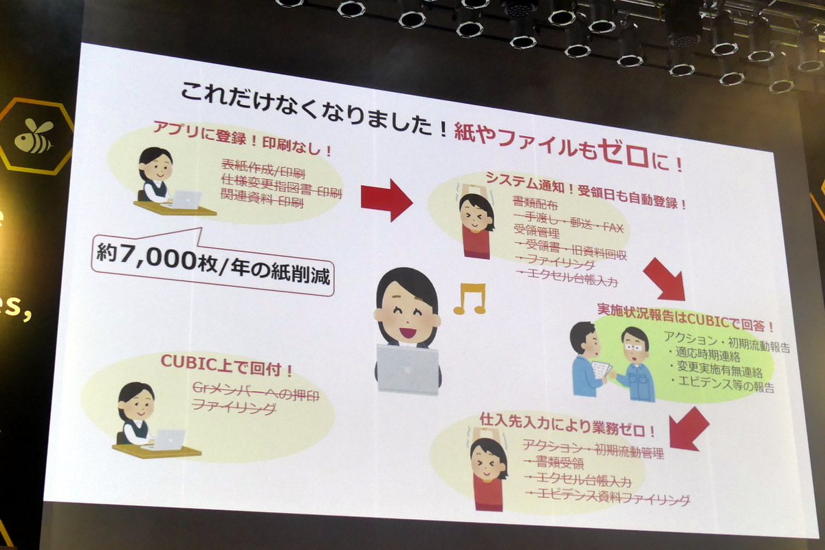 CUBICの導入効果は大きかった。仕入先からの回答がFormBridgeで入力されると、受領日や実施状況がkintoneのアプリに自動で登録されるので、CUBICでリアルタイムに確認できるようになった。仕様変更資料の作成や回覧、台帳への入力、押印、ファイリングなどの煩雑な業務が一気になくなり、年間で約7000枚の紙削減にもつながったという。