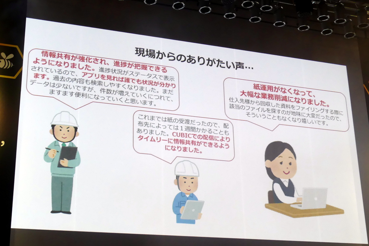 現場からも「担当者に聞かなくても、進捗が把握できるようになった」「1週間かかっていた紙の受領がなくなり、タイムリーに情報共有できるようになった」「紙運用がなくなり、大幅な業務削減になった」などの喜びの声があがった。「『紙様』はいませんでした」と齊藤氏と語る。