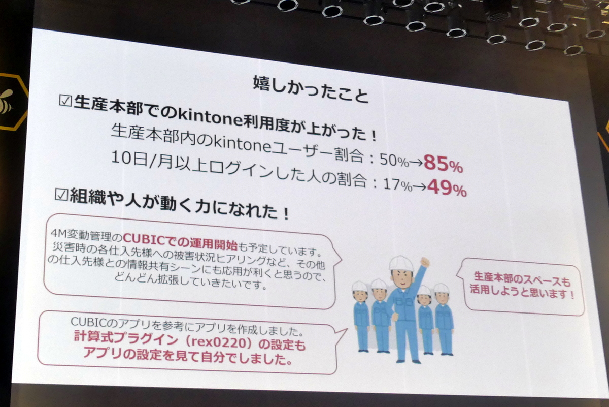 生産本部でのkintone利用度は50%から85%に上昇し、月に10日ログインしたユーザーも17%から49%に向上した。今後は4M変動管理のCUBICでの運用開始を予定しており、災害時における仕入れ先の被害ヒアリングにも利用される予定。CUBICのアプリを参考に自らアプリを作るメンバーも現れ、設定が大変な計算式プラグインも自ら行なったという。