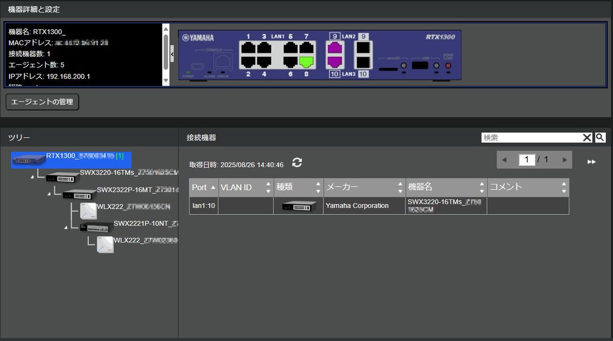 また、LANマップから各機器の管理画面にアクセスでき、各ポートのVLAN所属状況やリンクアップ状況などが把握できる。物理・論理構成を把握し、障害時に迅速に対処するための情報に素早くアクセスできる。さらに、端末一覧も表として表示可能だ。IP/MACアドレスや接続されているポートも一覧で見られる。端末がどのように接続されているかを追跡もできる。マネージャー (管理を行なうネットワーク機器) のモデルにもよるが、現状はエージェント機器 (管理対象のネットワーク機器) は最大128台まで制御可能となっている。