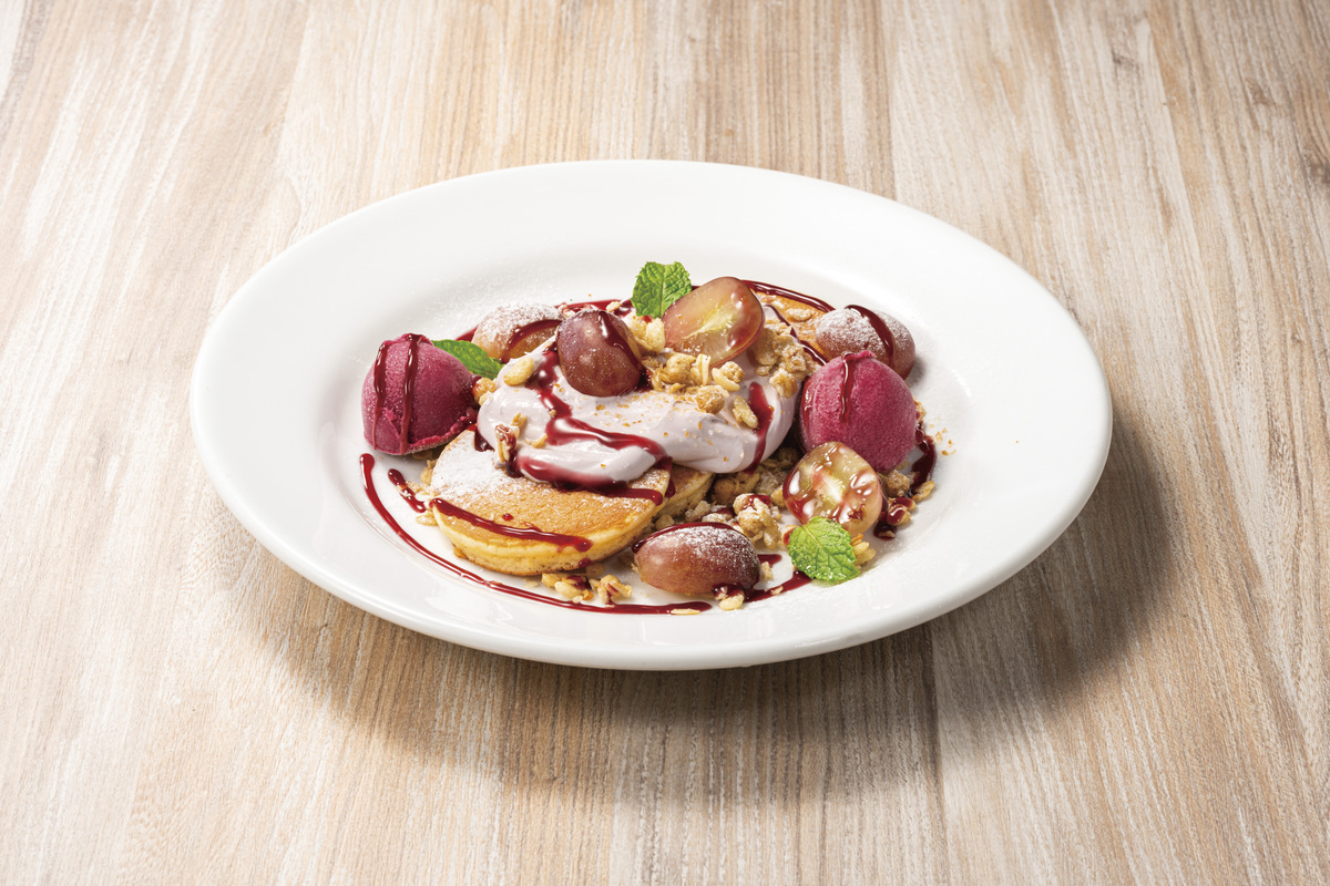 深い赤色が美しいクイーンルージュが彩る、ふんわりと焼き上げたパンケーキ。なめらかなクリームや甘酸っぱい赤ぶどうソースで、見た目も華やかにデコレーション。