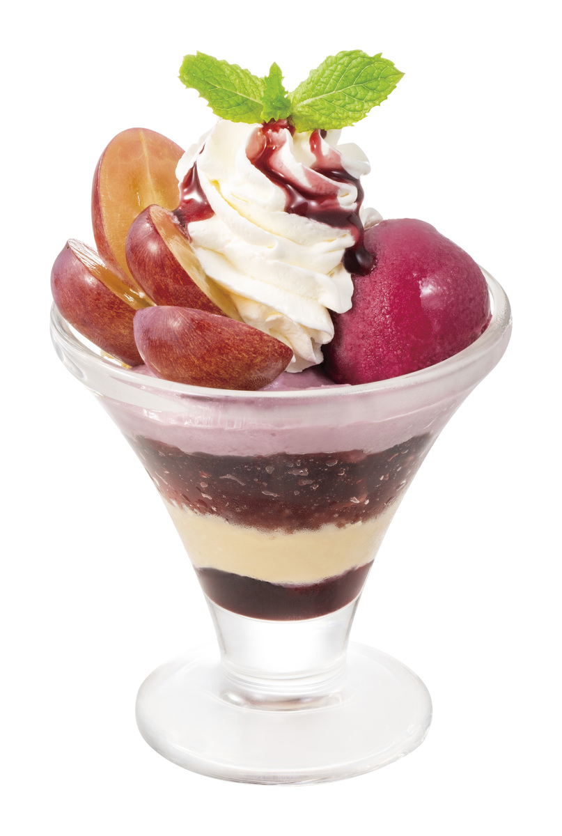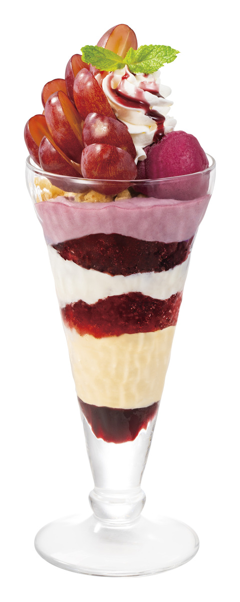 クイーンルージュが彩る、秋らしく華やかな装いのパルフェ。ソルベ、クリーム、ゼリー、ソースと、赤ぶどうを味わう素材をバラエティ豊かに重ねている。チーズのコクとラズベリーの酸味がマッチした、ラズベリークリームチーズアイスも相性抜群。