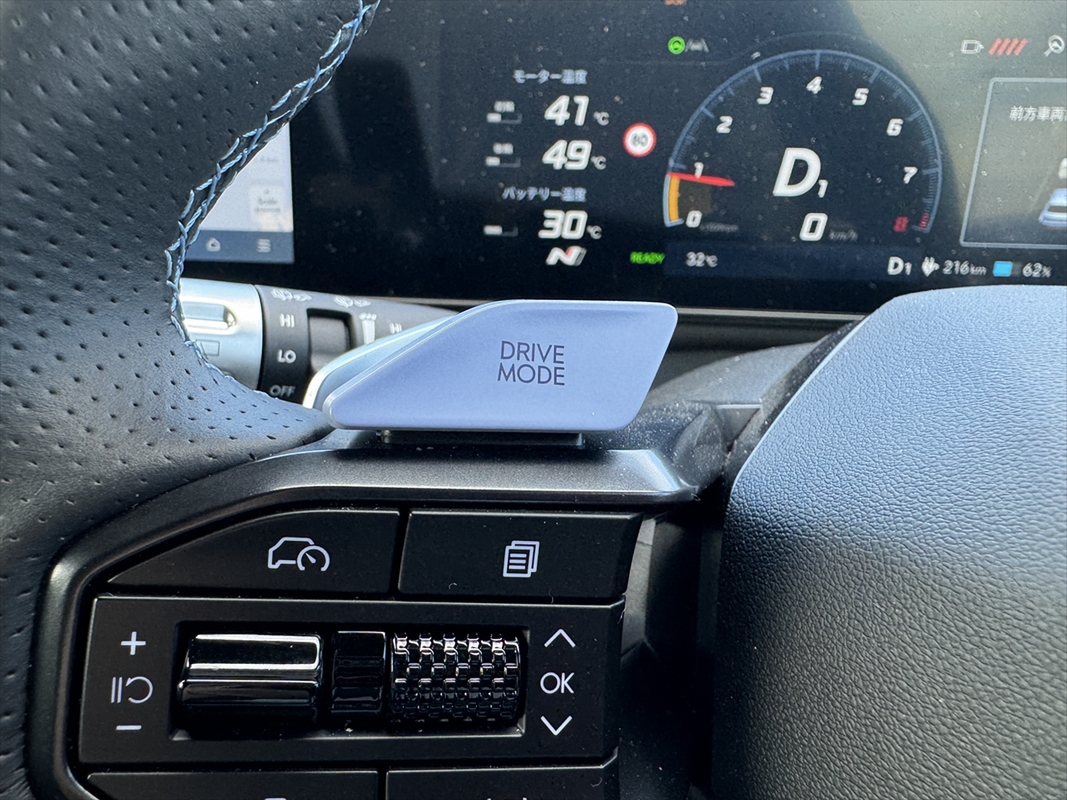 乗ってみてすぐに混乱するのがスイッチの多さ。最近は物理スイッチを減らすメーカーが多い中、IONIQ 5 Nには謎なボタンがたくさんあります。とりあえず左上の水色のスイッチがドライブモードの選択なので、ここからスポーツモードに変更し出発。今回は千葉県から会津若松市までの300km超のロングドライブです。