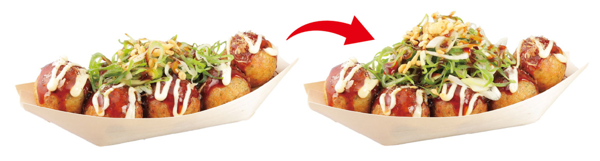 アツアツのたこ焼に特製の甘口ソースと削り節、マヨネーズを合わせ、シャキシャキ食感と独特の風味を持つ九条ねぎをたっぷり添えた一品。