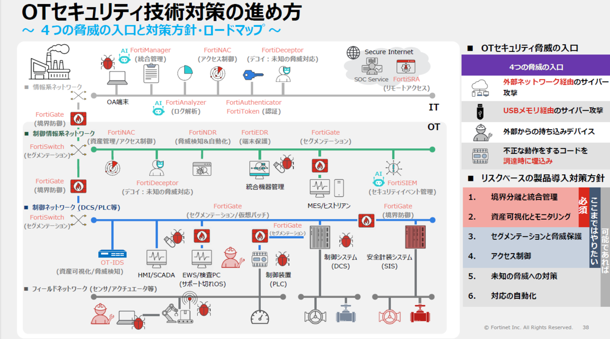 フォーティネットの推奨としては、まずITネットワークとOTネットワークの境界にFortiGateを設置し、資産の可視化とモニタリングまでは必須。残りのセグメンテーションや脅威保護、アクセス制御、未知の脅威への対策、対応の自動化といった対策は、起った際の被害の大きさにあわせて、対策の有無を取捨選択する必要があるという。「従来のシステムを全部セキュアに変えるのは現実的には難しいし、コストもかかります。どこまで許容するか、許容できない部分はどこかを考えるリスクマネジメントが大事なのですが、製造業が苦手な部分でもあります」(藤原氏)。