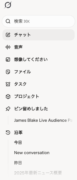 左メニューには通常のチャットをする「チャット」、PCのマイクで入力する音声モードに切り替える「音声」、画像や動画を生成する「想像してください」、PDFやテキストの要約/解析をする「ファイル」、作業メモを管理する「タスク」、会話や資料を案件単位で整理できる「プロジェクト」、よく使うスレッドを保存する「ピン留めしました」、そして過去のやり取りが保存される「沿革」が並ぶ。