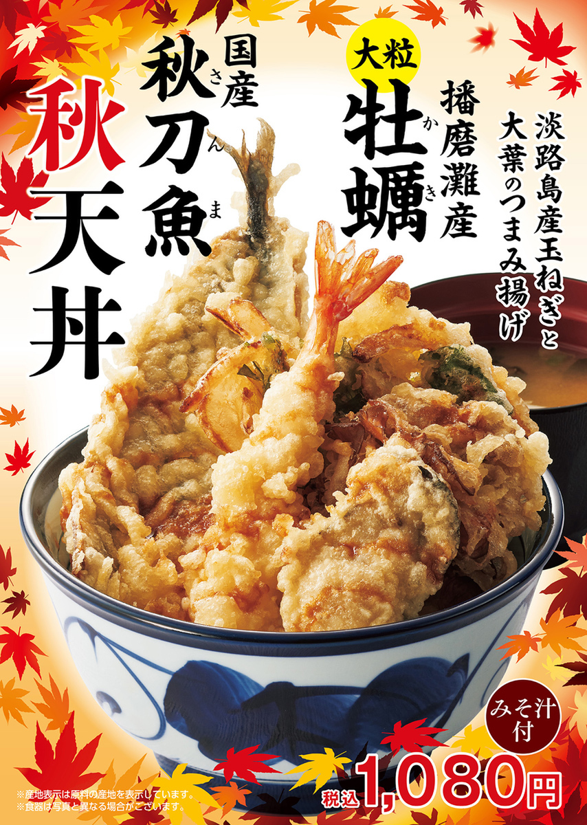天丼てんやは9月25日から、秋の期間限定メニュー「牡蠣と秋刀魚の秋天丼」「牡蠣とごぼうの冷やしそば」を発売します。