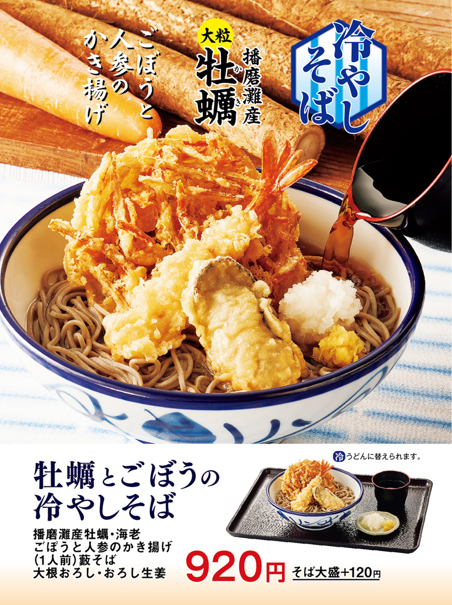 大粒の牡蠣とごぼうと人参のかき揚げ、海老をのせた冷やしそばです。かつお風味の特製つゆをかけていただく、まだ暑さの残る時期にぴったりという一品です。