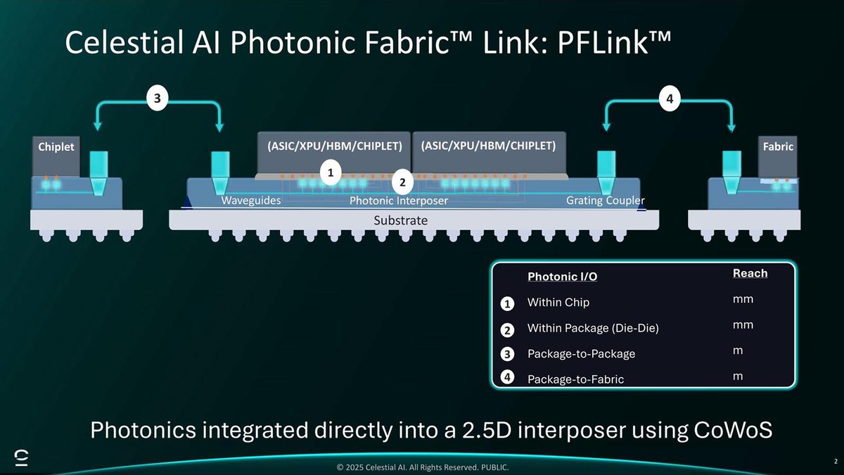Celestial AIのターゲットは下の画像に示すように、Photonic Fabricの構築である。具体的にはチップ間接続とダイ間接続の両方をOpticalで行なうことを想定している。ちなみにこれはPFLinkという名称になっている。