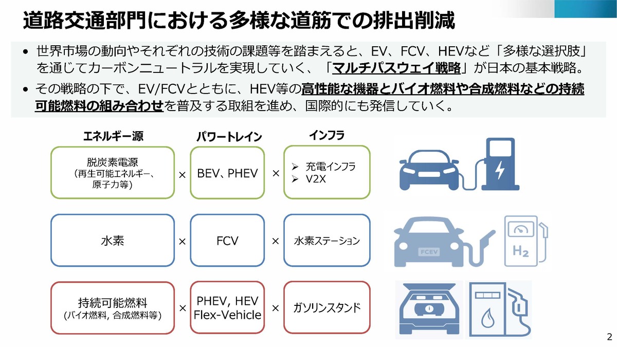 イベントで最初にプレゼンを行ったのは、経済産業省資源エネルギー庁資源・燃料部燃料供給基盤整備課の東 哲也氏です。東氏は「日本の道路交通部門における基本戦略はマルチパスウェイ戦略である」と説明します。日本はEV/FCV(燃料電池車)だけでなく、バイオ燃料や合成燃料といった持続可能燃料を使うHEV(ハイブリッド)なども組み合わせて、交通部門のCNを目指していくというのです。