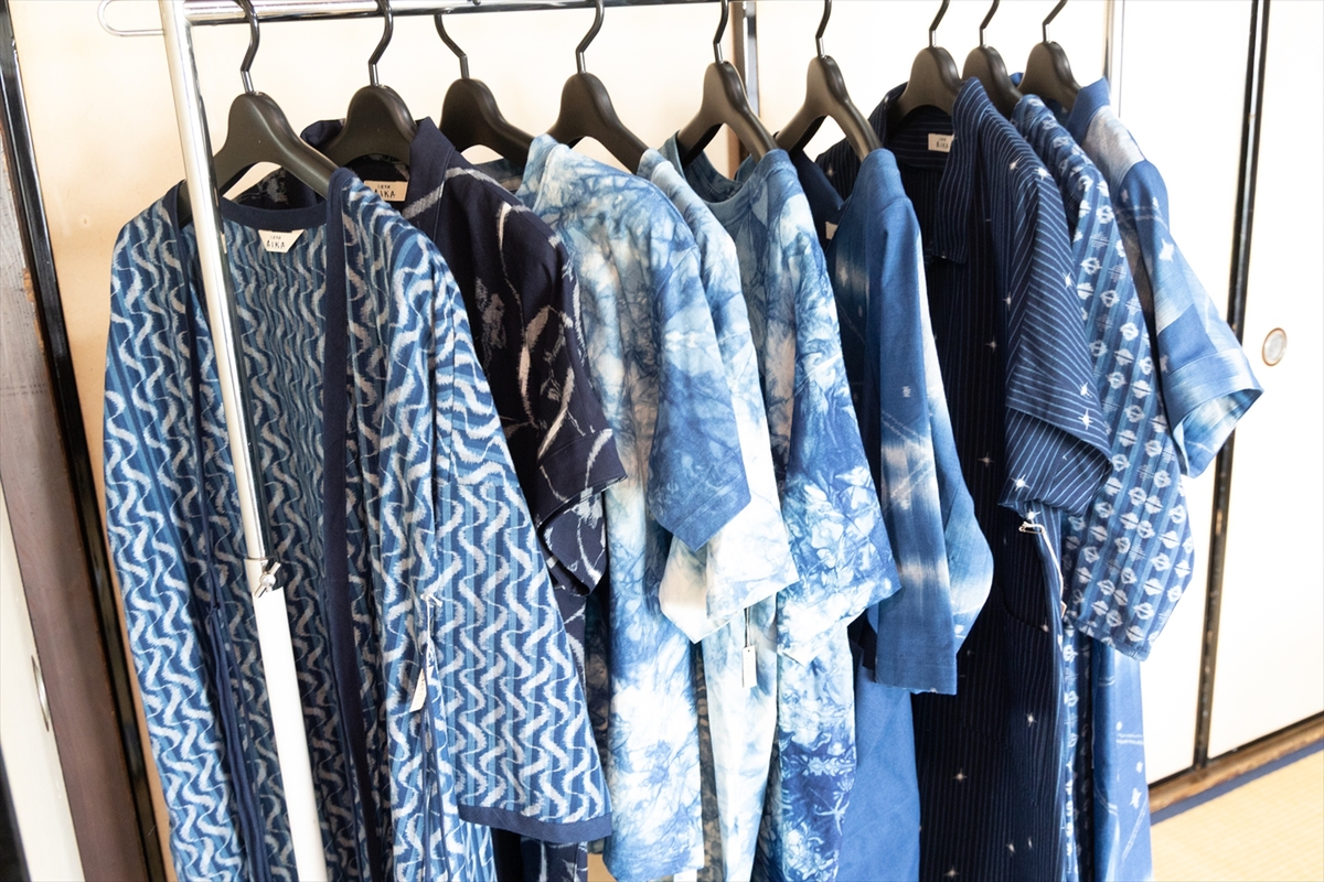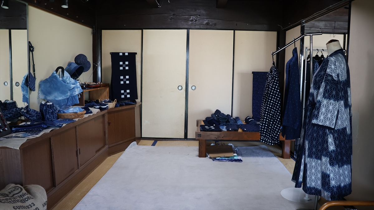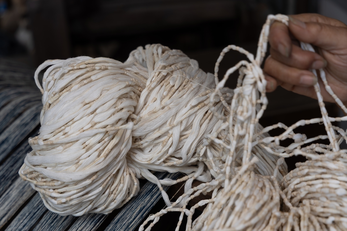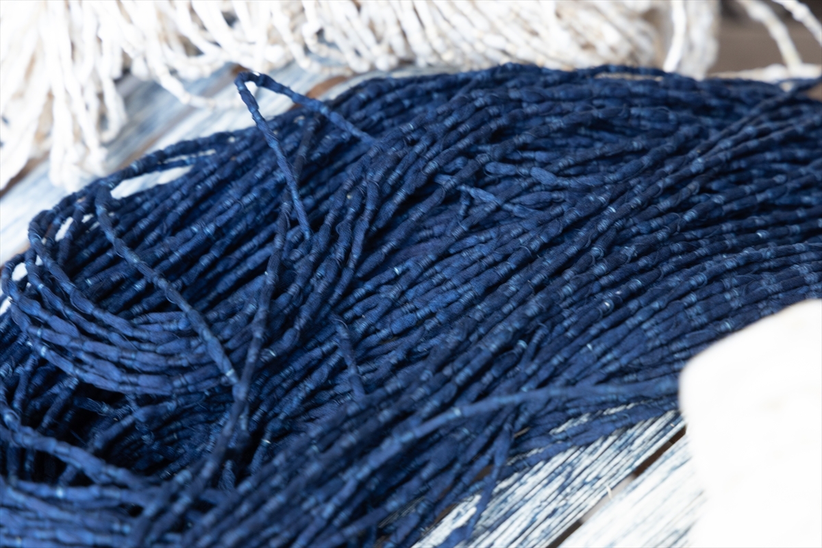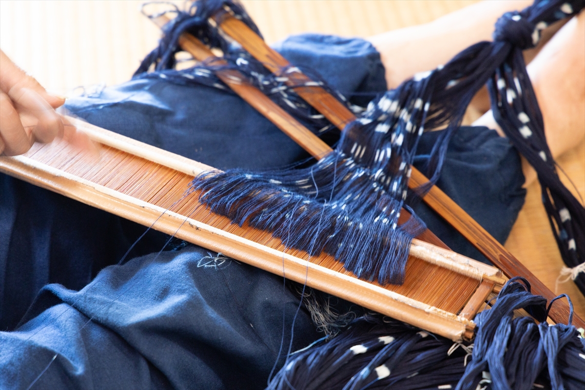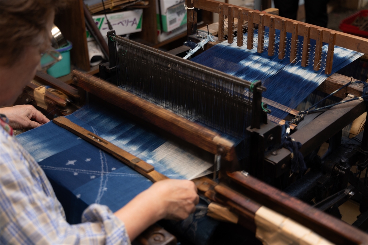 「藍華 田中絣工房」では、糸を束ねて、染めない場所を縛る「括り」から染色、そして機織り機を使うところまで行なっている。