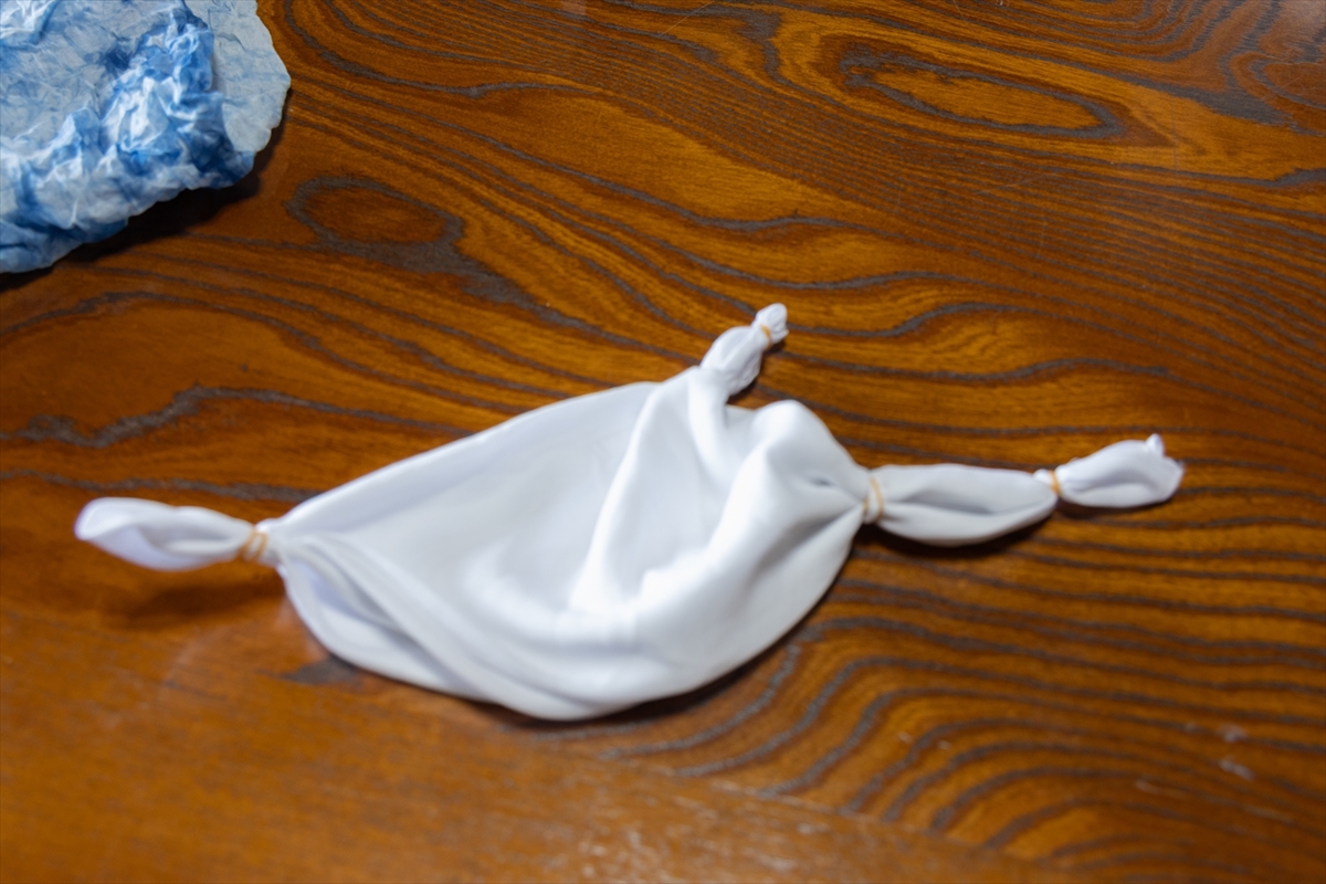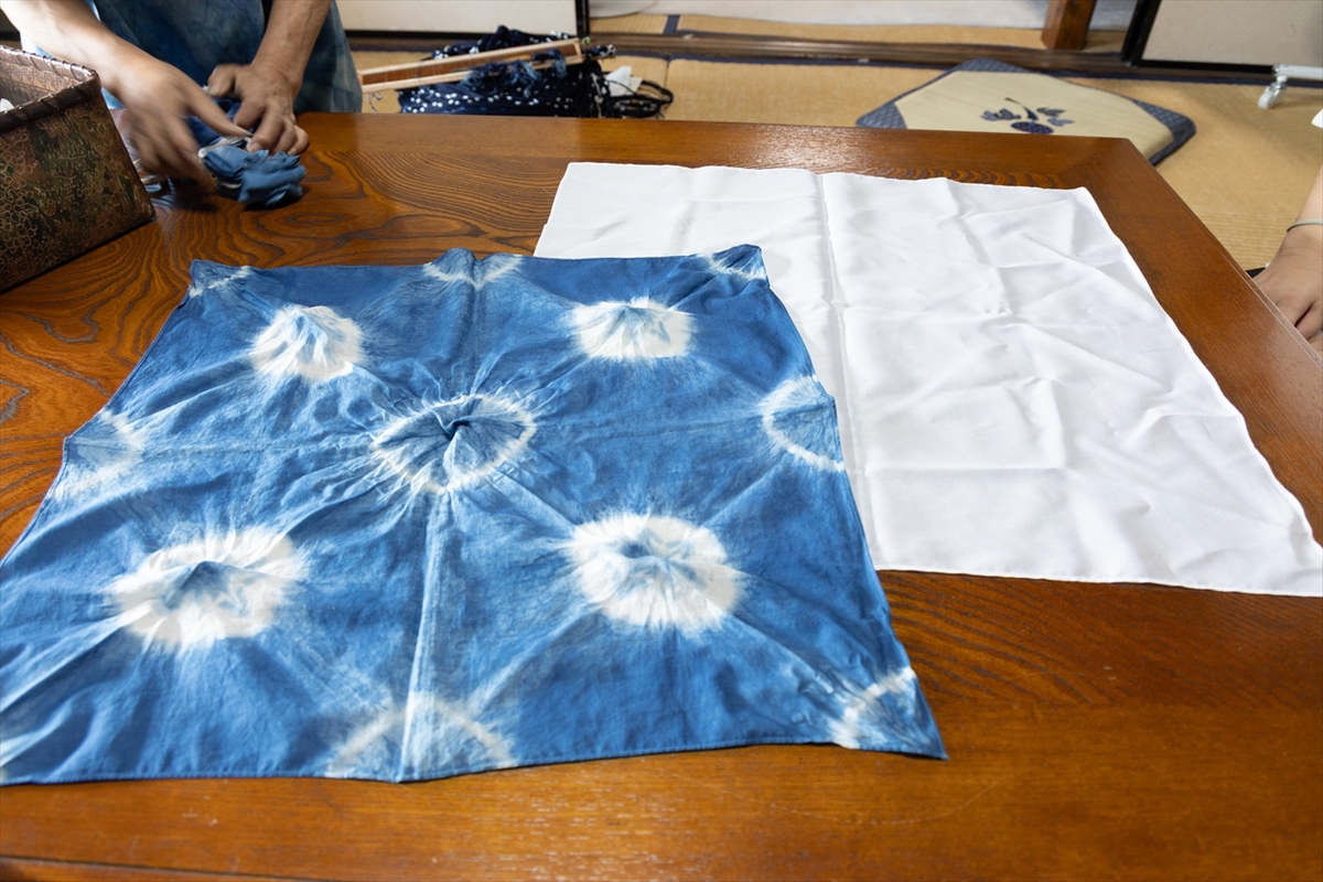 工房体験では、そのうちの藍染をハンカチで行なった。ハンカチを折りたたみ、輪ゴムで一部を縛る。縛ったところは白い部分として残る、という事はわかっているのだが、でき上がりがイマイチ想像できない。童心に帰った気分と普段使わない脳の一部が格闘する。