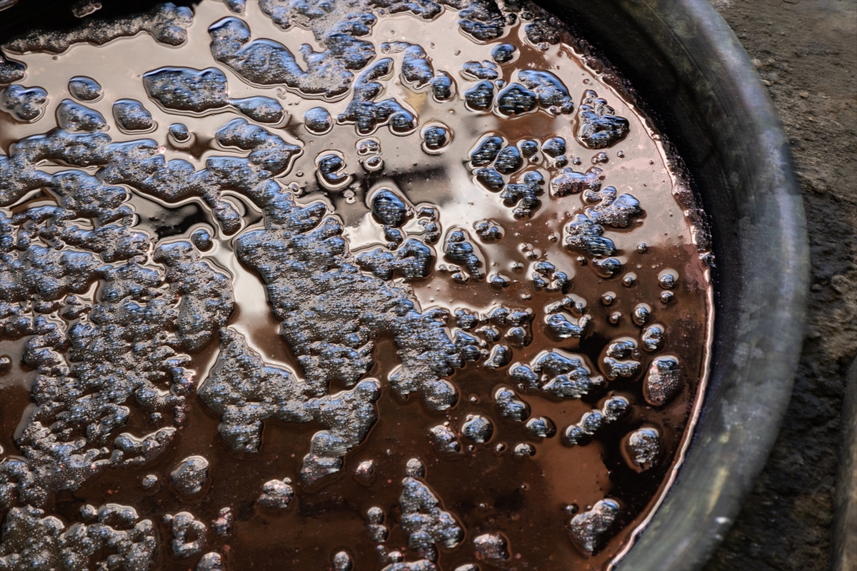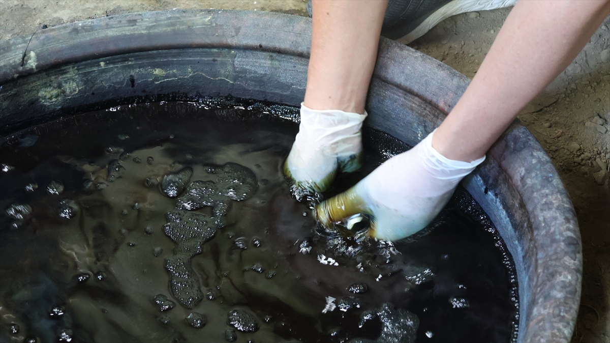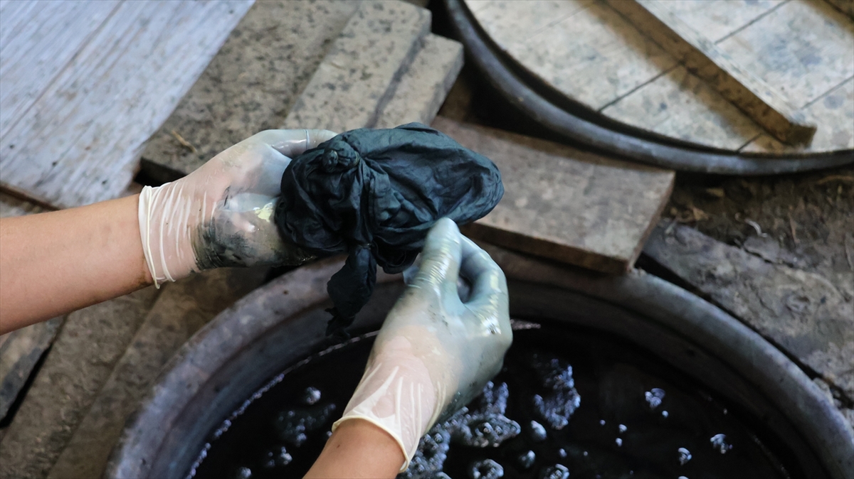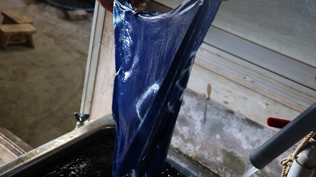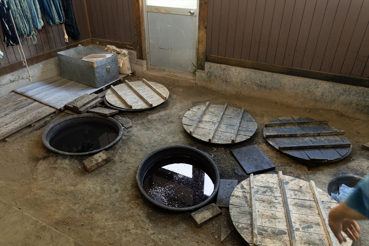 決まったところで、いざ藍染。藍桶からほんのりと甘い香りが漂う。藍染には発酵が欠かせないそうで、日によって桶のコンディションは異なるという。