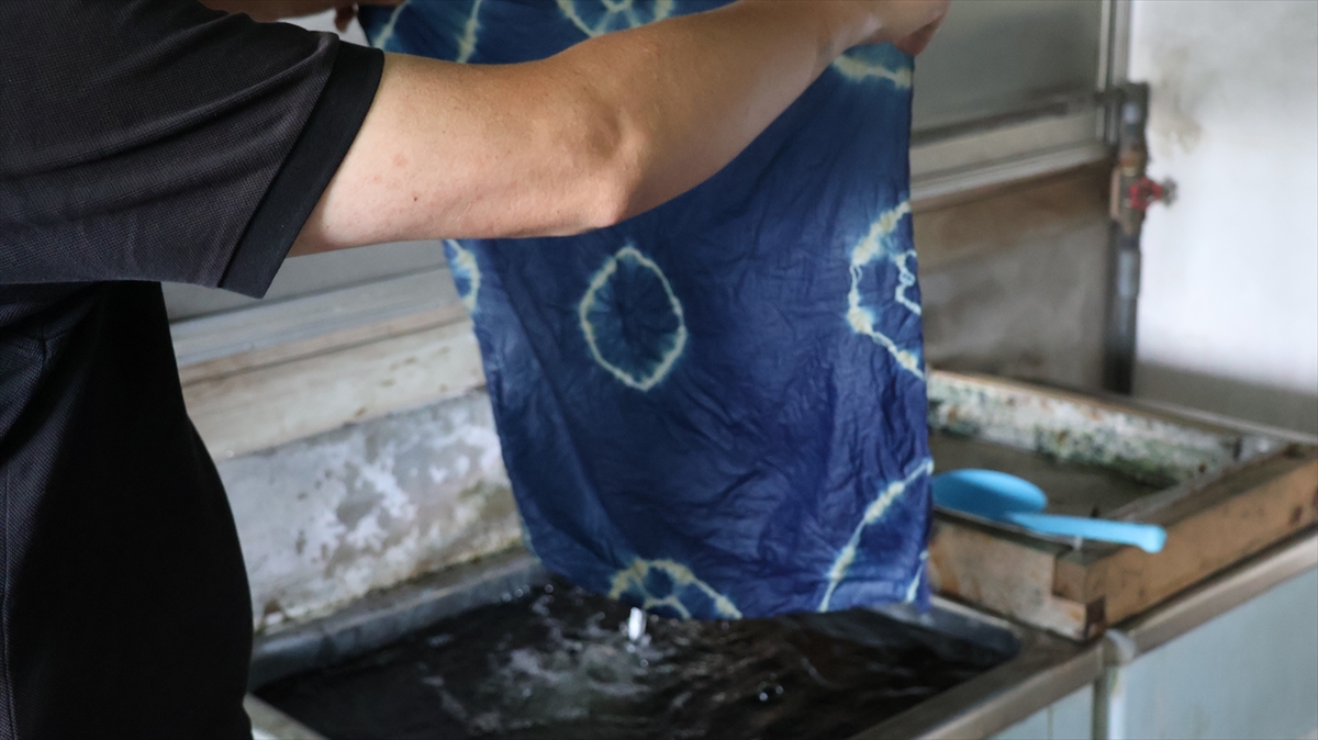 ハンカチを桶に入れながら手もみし、絞っては空気に触れさせ、そして再び桶に染色作業をする。自然に触れることが少なくなった手には新鮮な感覚だ。これを中腰で約10回。次第に辛くなり、体の衰えを感じ始めたところで作業が終わった。