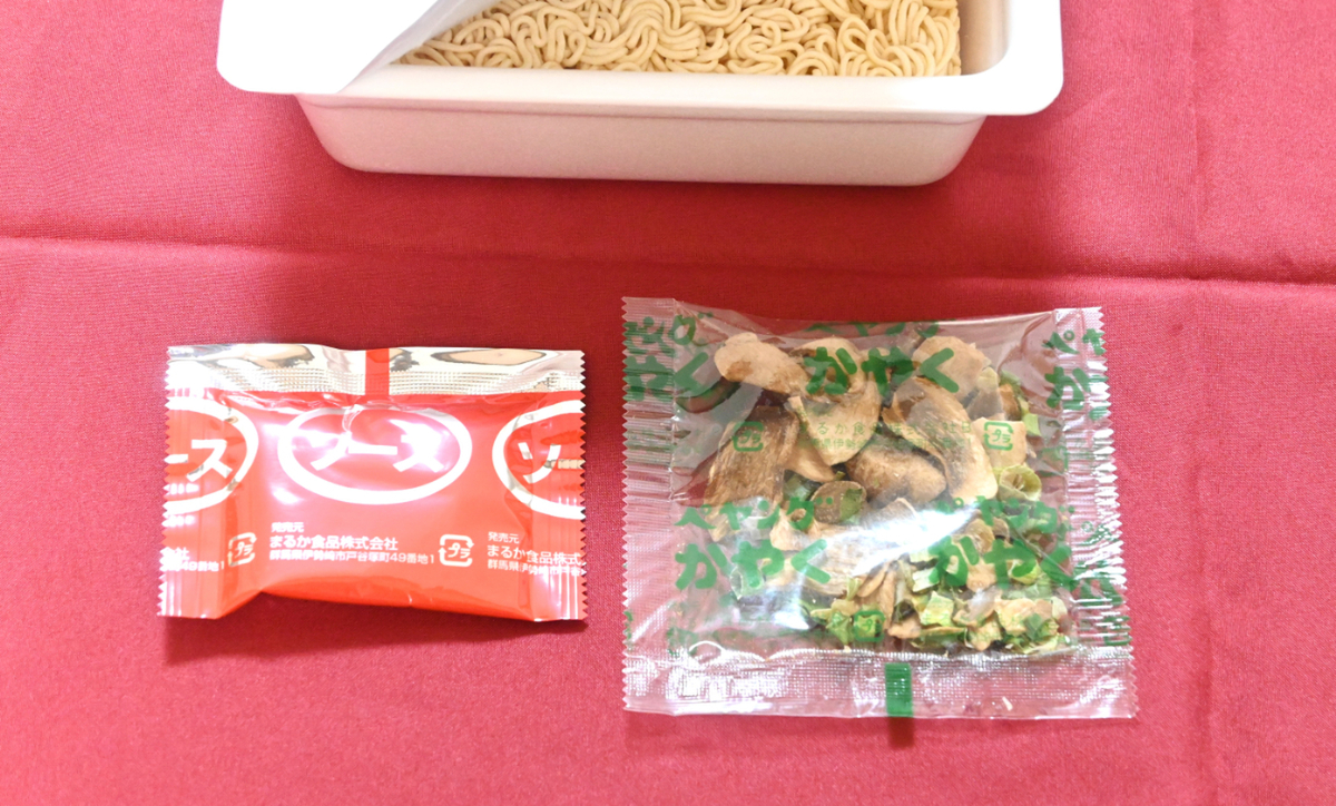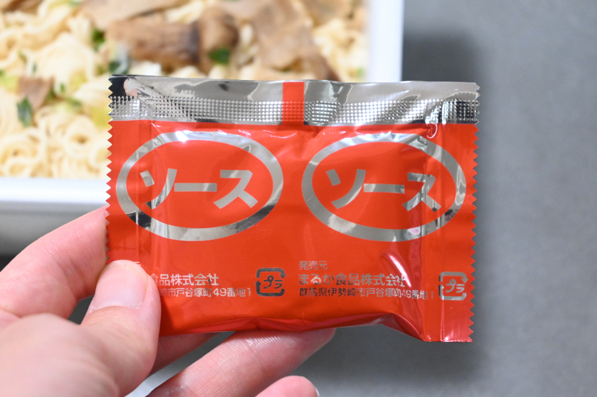 ソースは湯戻しの最中に蓋の上で温めておいて、湯切り後に後がけです。商品説明によると、醤油ベースに出汁の旨味をたっぷりときかせた味わいなんだとか。いつものソースとは異なります。