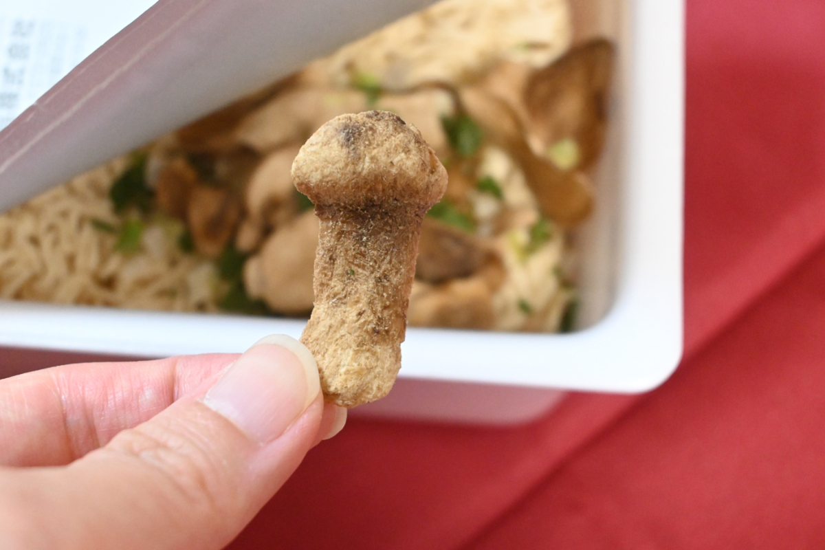 松茸の香りは……。う~ん、ほのかに芳醇な香りが漂います。乾燥松茸なので華やかに香り立つほどではなく、やや控えめではあります。例えば、お弁当のオマケでついてきた、粉末の松茸のお吸い物の香りのような、そんなイメージです。