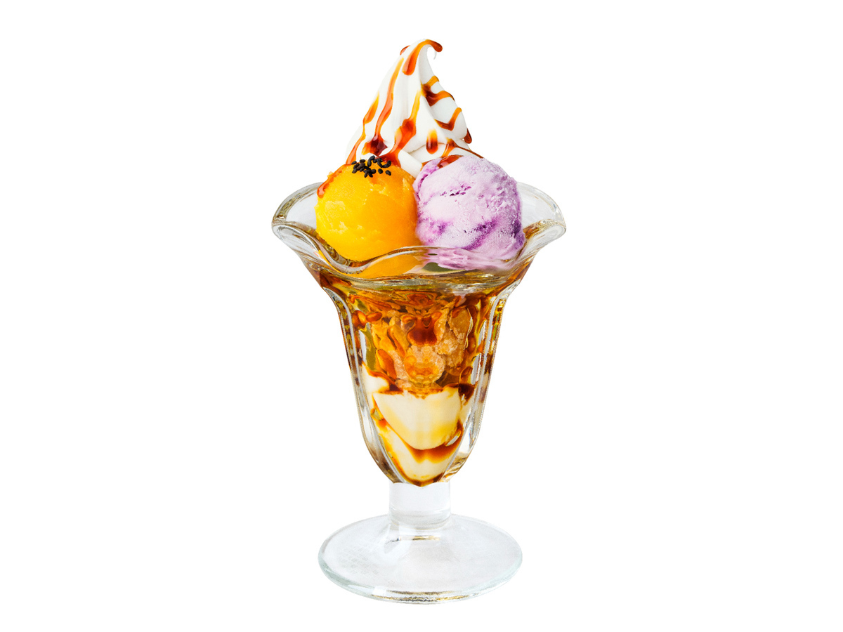 紫芋アイスやプリン、カラメルソース、黒ゴマなどを重ね、さつまいもの濃厚な甘みと多彩な食感を味わえるパフェ。さらにサクサクのコーンフレーク、ソフトクリーム、風味豊かな黒ゴマなど、様々な素材が層をなすことで、変化する食感を楽しめます。