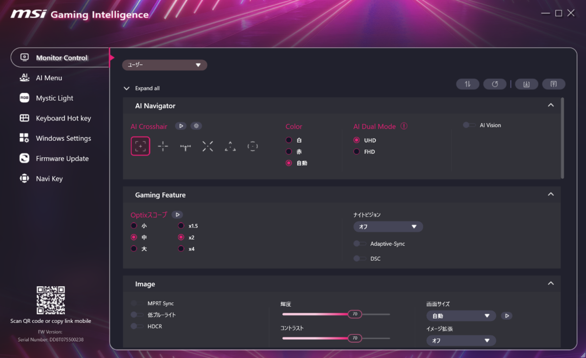 さらに、PCとUSB接続して「Gaming Intelligence」アプリを導入することで、キーボードやマウス操作で切り替えが可能だ。OSDで操作できる各種設定もアプリから変更できるため、非常に楽である。対応グラフィックボードとの組み合わせで、カクつきやティアリングを抑える「Adaptive-Sync」機能や、暗いシーンでも見やすく調整する「AIビジョン」機能のほか、目の疲れを低減する「ブルーライトカット」や「アンチフリッカー」なども用意されている。